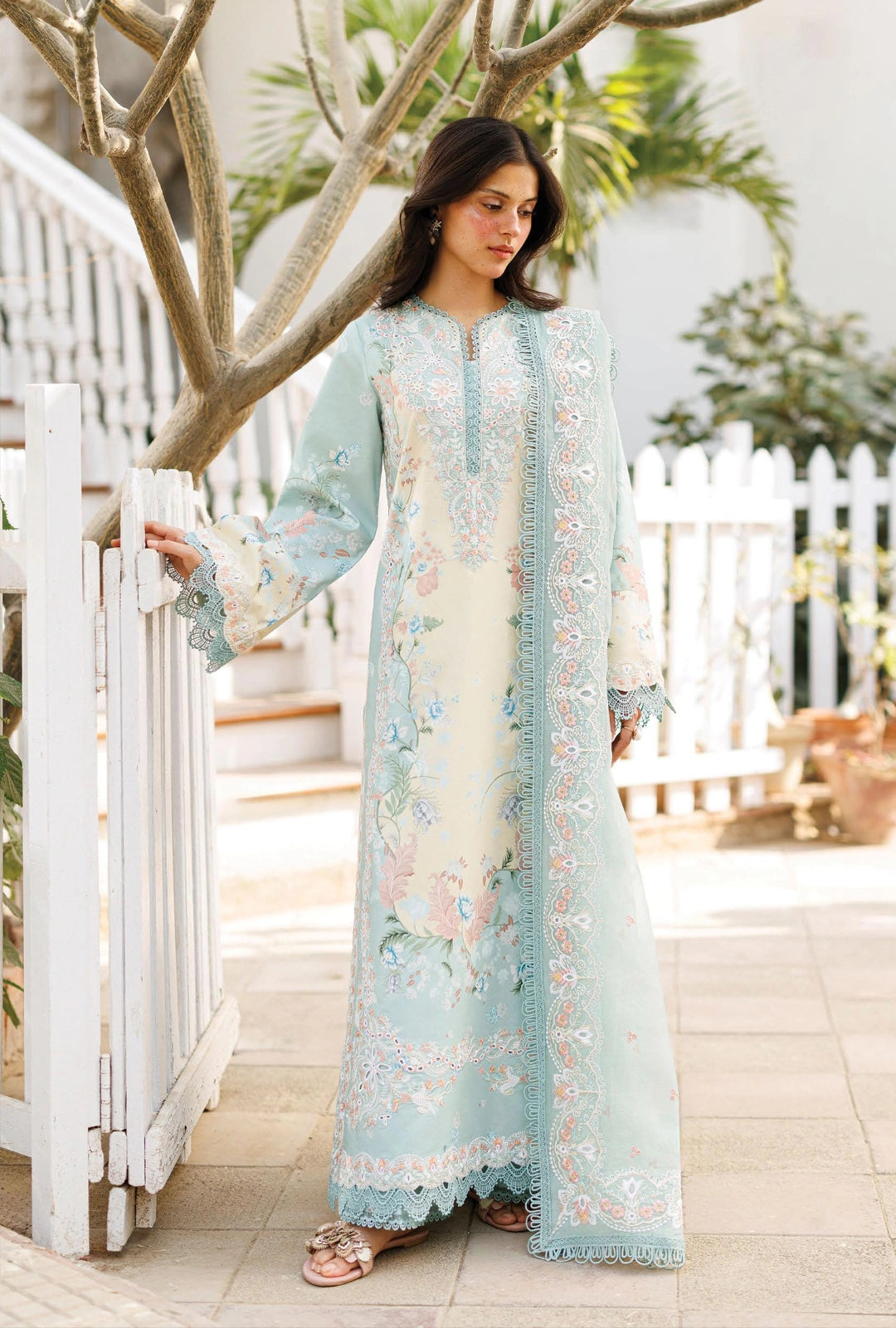 Embrace effortless charm with SELEA, a 3-piece unstitched lawn ensemble in soft pastel aqua. The long shirt features delicate floral prints and intricate embroidery, enhanced by finely worked borders along the neckline and sleeves, creating a gentle, romantic texture. Its relaxed, flowing silhouette ensures graceful movement while maintaining a refined structure. Paired with coordinated wide-leg trousers, this ensemble feels light, airy, and perfect for sunlit days or casual elegant occasions.