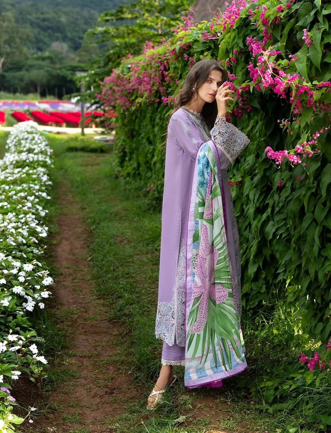 Dewdrop Dance is an elegant interplay of delicate embroidery and artisanal detailing. The lawn shirt features chikan embroidery on the front, complemented by embroidered detailing on the back and sleeves. The design is elevated with organza accents at the neckline, sleeves, daman borders, and side slits, along with three-dimensional floral embroidery at the neckline for added depth and refinement.