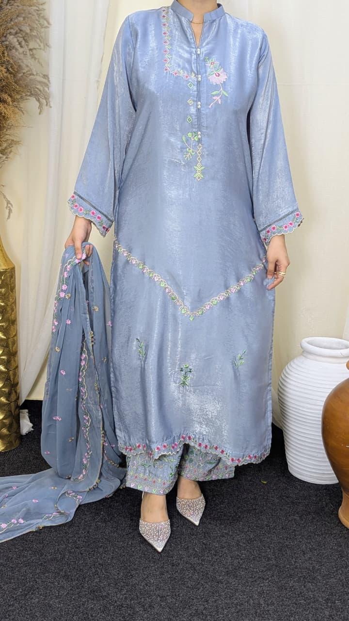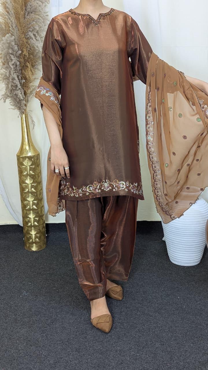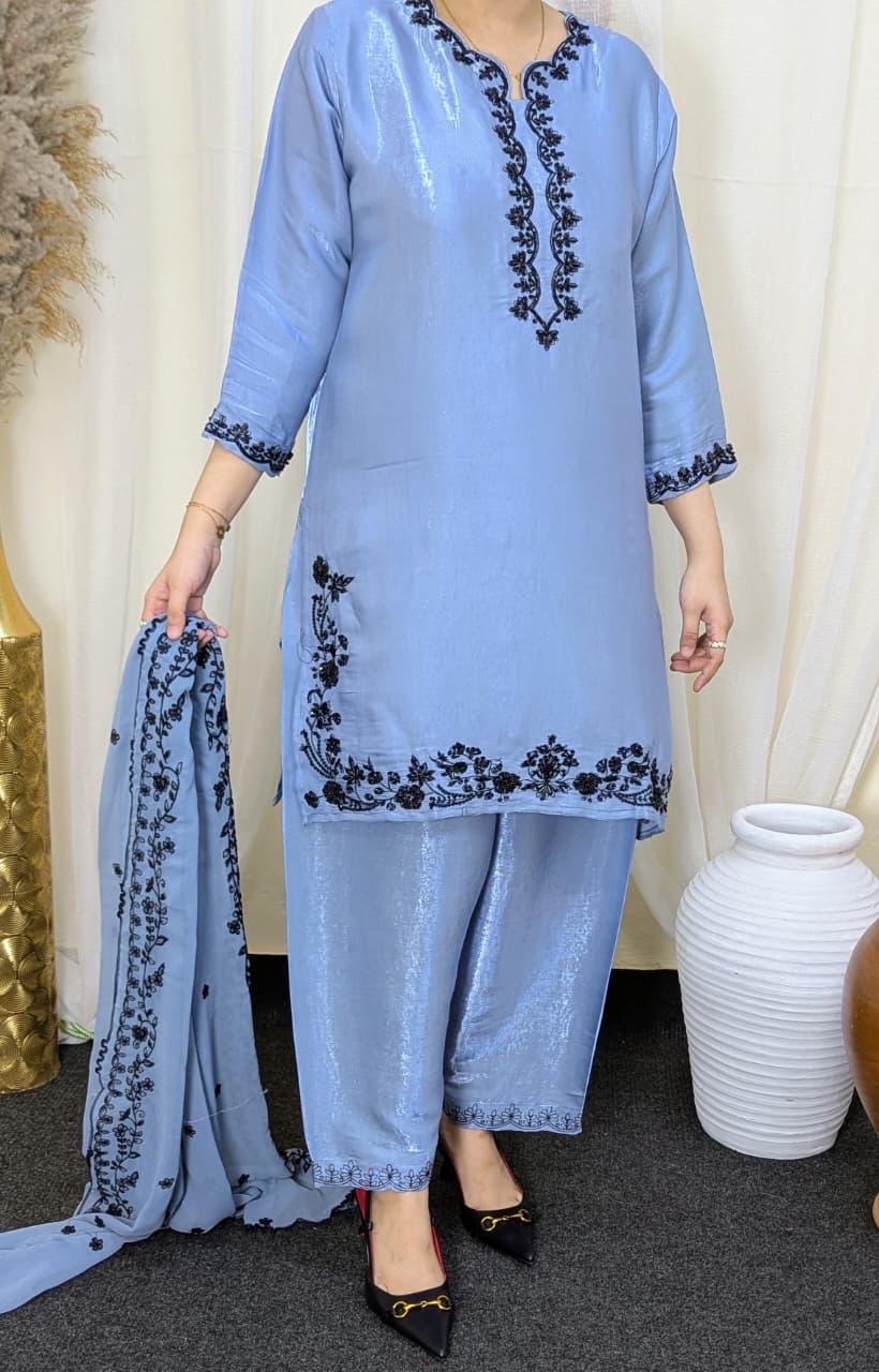 Product Description:Add a touch of elegance to your wardrobe with this Amna Khurram silk 3-piece...