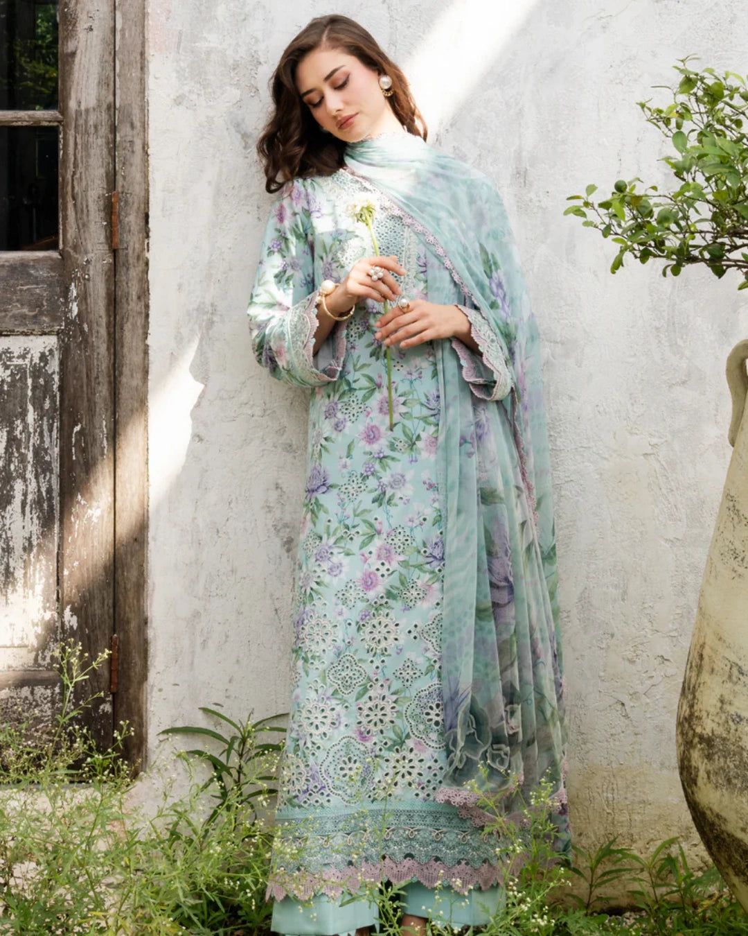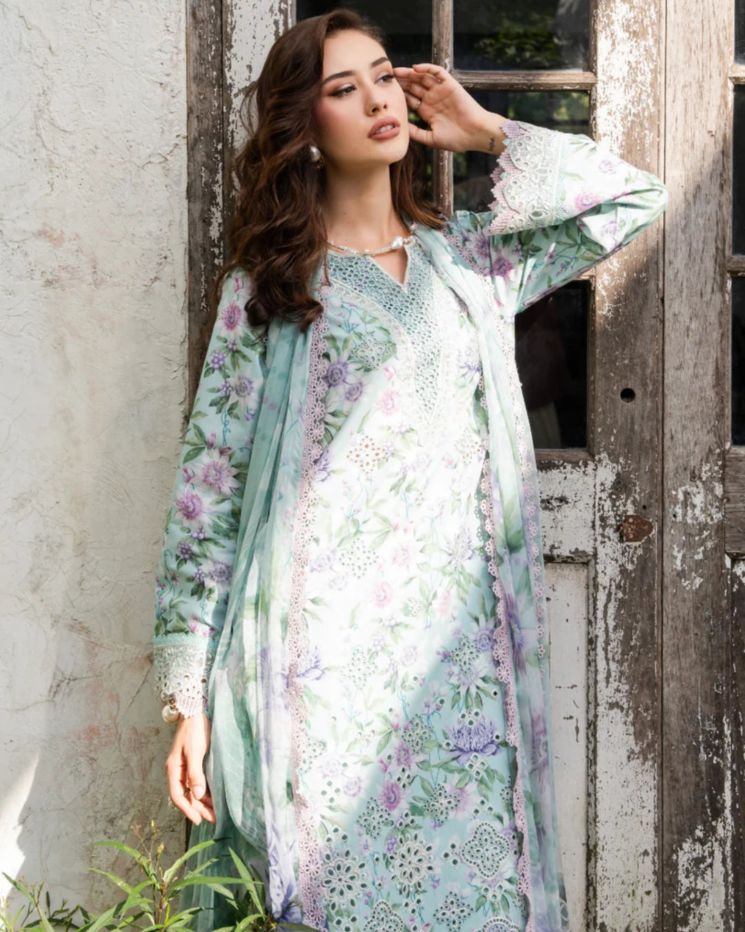 The Amara Chikankari Lawn Suit blends traditional chikankari embroidery with modern printed designs for an elegant and festive look. This unstitched 3-piece set features a chikankari embroidered printed lawn shirt with a neck patch, front and back daman borders, and embroidered sleeves. It is paired with a dyed cotton trouser and completed with a ready-to-wear printed premium chiffon dupatta adorned with 4-sided Schiffli lace — perfect for summer events, festive occasions, or formal gatherings.