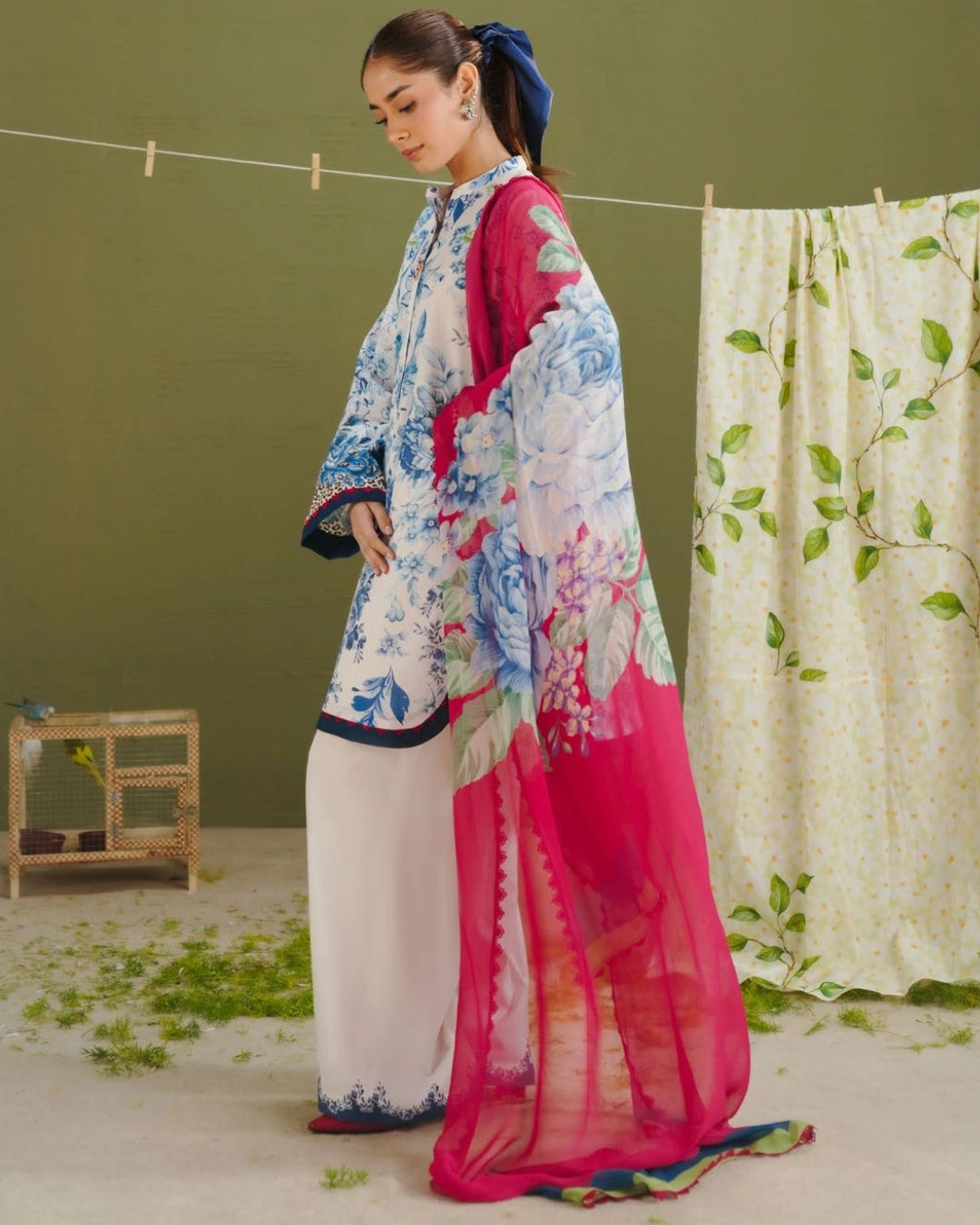 This 3-piece printed lawn suit from COCO Prints blends bold color accents with elegant floral design. The chiffon dupatta is beautifully printed with blue roses on a hot pink base and finished with refined blue and olive green borders, adding a striking contrast to the ensemble.