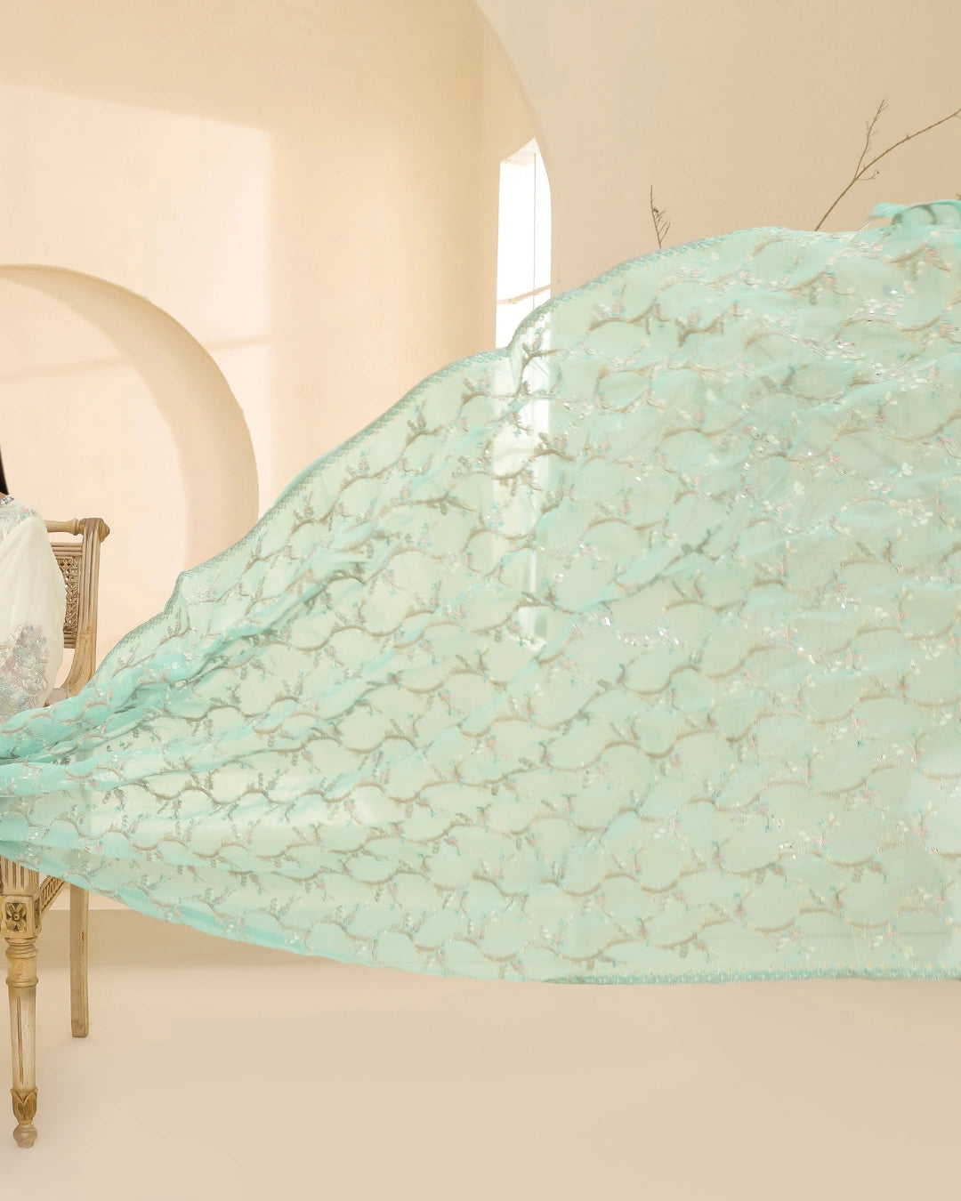 This elegant three-piece ensemble from House of Siyaab UAE is designed for women who appreciate subtle embroidery and comfortable fabrics. The outfit features an embroidered bamber chiffon shirt, also described as an embroidered crinkle shirt, offering a lightweight texture with a graceful fall.
