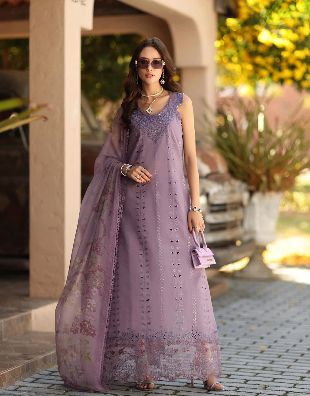 This elegant design french violet hue features a beautifully schiffli-embroidered front, delicately accented with sequins arranged in a subtle straight-line pattern, creating a refined shimmer. The ensemble is further enhanced with an intricate schiffli border that adds depth and sophistication to the silhouette.