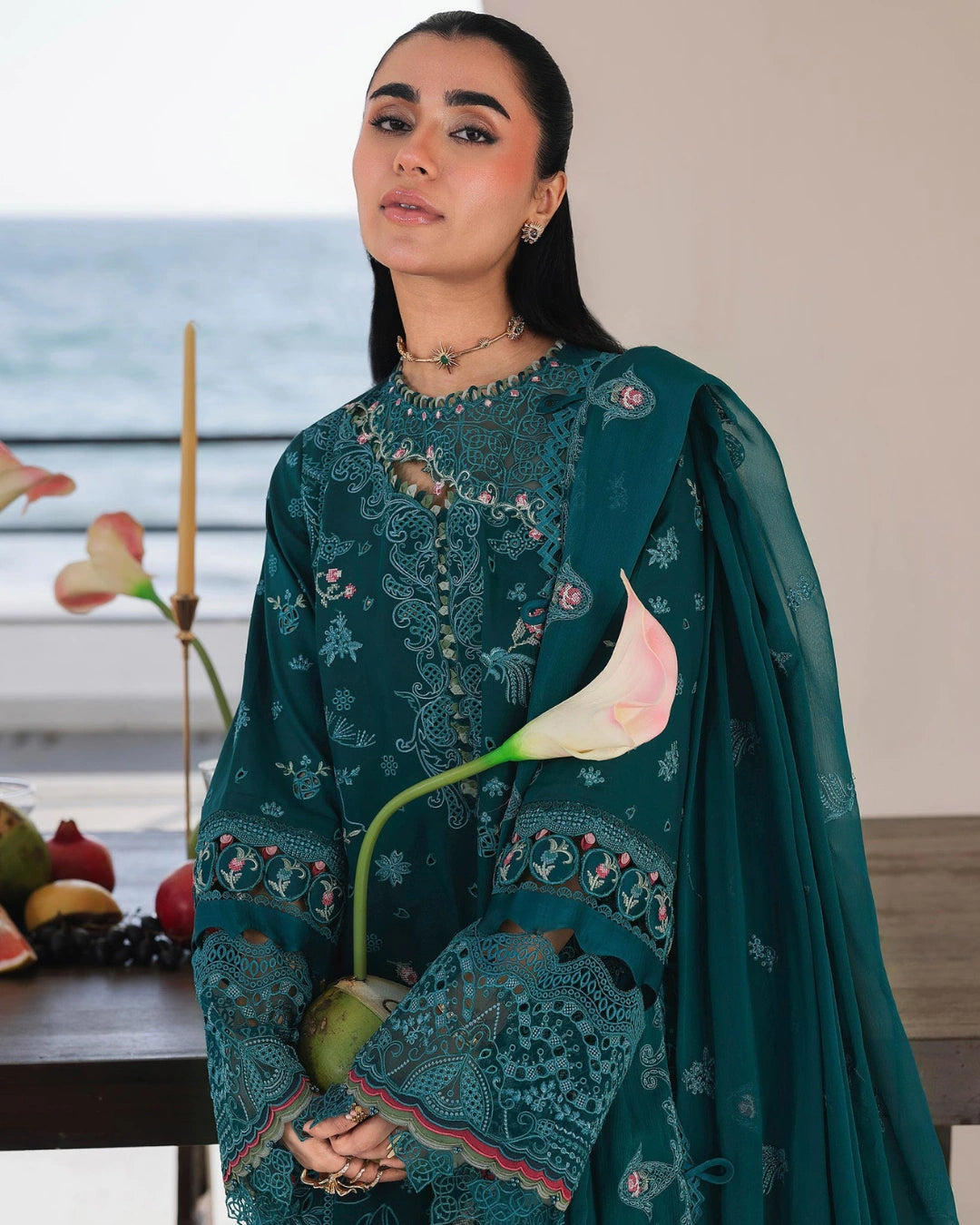 This Chikankari & Laser Cut Embroidered Luxury Lawn Suit is the epitome of elegance and craftsmanship. The lawn shirt features intricately embroidered center, left, and right panels, enhanced with embroidered side motifs, a lace-detailed neckline, and embroidered tassels on sleeves. Chikankari embroidered sleeves with charmeuse silk lace and borders add a premium finish.