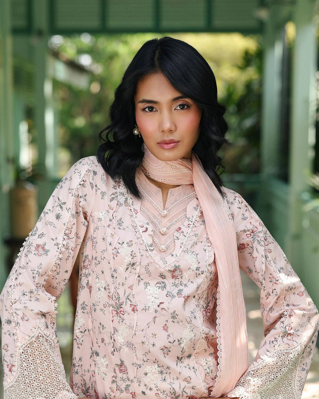 This digital printed lawn unstitched suit by NEVE beautifully merges contemporary digital prints with traditional chikankari embroidery for a graceful, timeless ensemble. The shirt features a digitally printed front, back, and sleeves, enhanced with chikankari embroidered borders on the front and sleeves, adding intricate detailing and elegance.