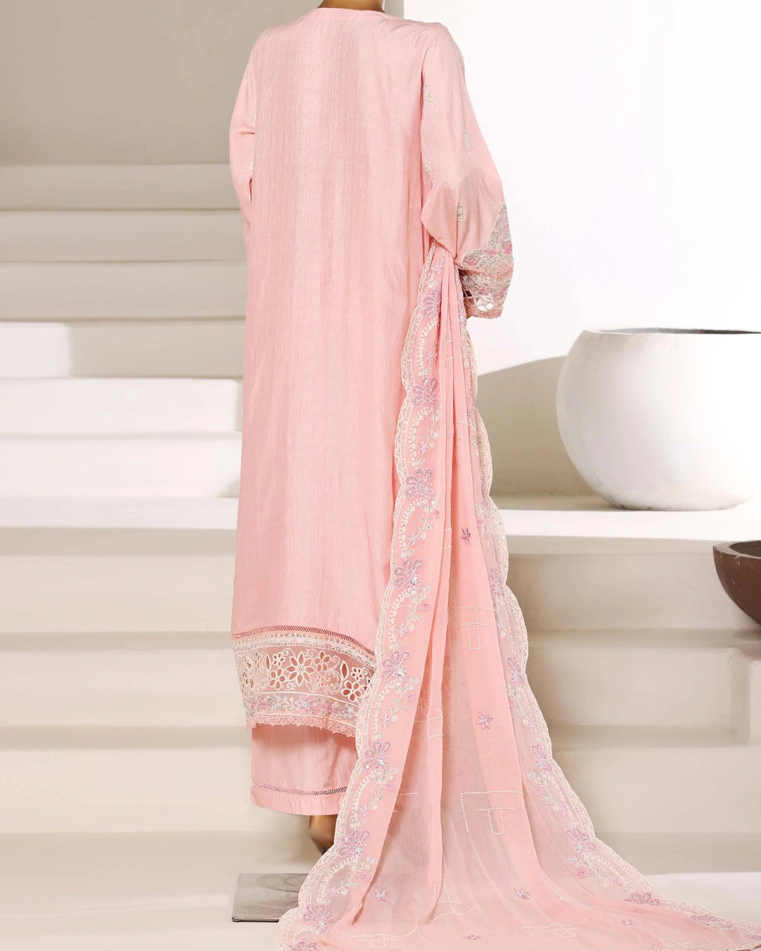 This graceful ensemble features a digitally printed and finely embroidered lawn shirt, paired with a comfortable dyed cotton trouser and a flowy digital print lawn dupatta.